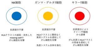 がんを攻撃する免疫細胞には自然免疫系のNK細胞、獲得免疫系のナイーブTから生じたキラーT細胞のほかにガンマ・デルタT細胞があります。ガンマ・デルタT細胞は自然免疫系と獲得免疫系の両方の性質を併せ持つ細胞で、抗原提示を必要とせず、HLAクラス1の発現に関わりなく、がん細胞が発する異常シグナル(メバロン酸代謝経路のイソペンテニルピロリン酸IPPなど)を感知し、NK細胞とは異なるスペクトラムでがん細胞を認識・攻撃する細胞であり、さらに他の免疫細胞を活性化して免疫システム全体を強化するなど多彩な機能を有しています。